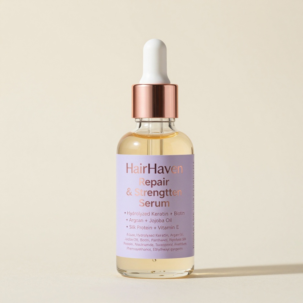 HairHaven Repair & Strengthen Serum is a potent leave-in treatment that repairs damaged hair, reduces breakage, and restores strength from root to tip. Enriched with keratin and nourishing oils, it leaves hair smoother, stronger, and more resilient.